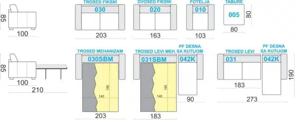 Jas. sedišta | Poliuretanska pena gustine 32 kg/m³ + sloj akrilnih vlakana gustine 200 gr/m² |