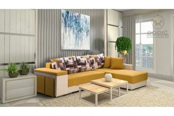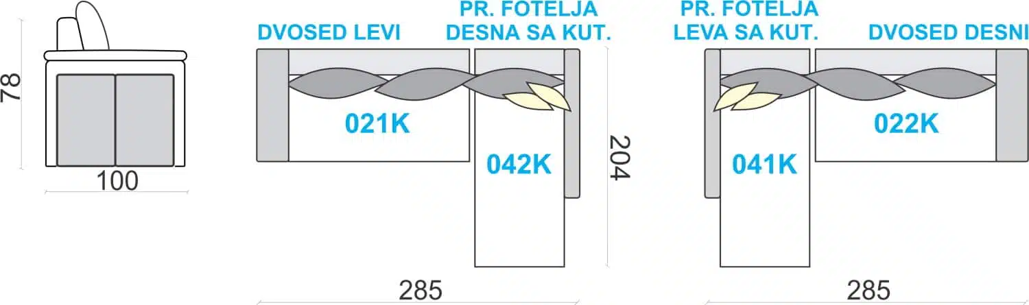 Jas. naslona | 80×55 sa kederom – dvosed l/d – 2 kom.; produžena fotelja – 1 kom; Punjeni mešavinom pahuljica od poliuretanske pene i akrilnih vlakana |