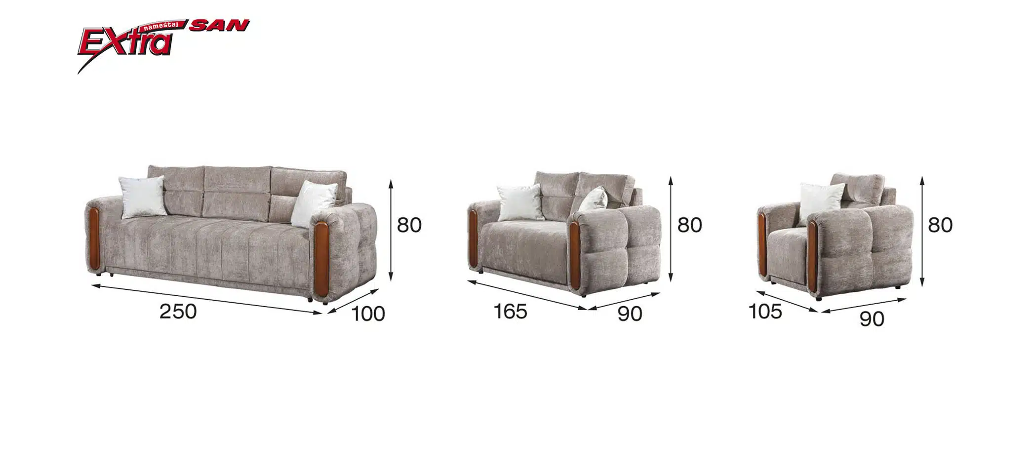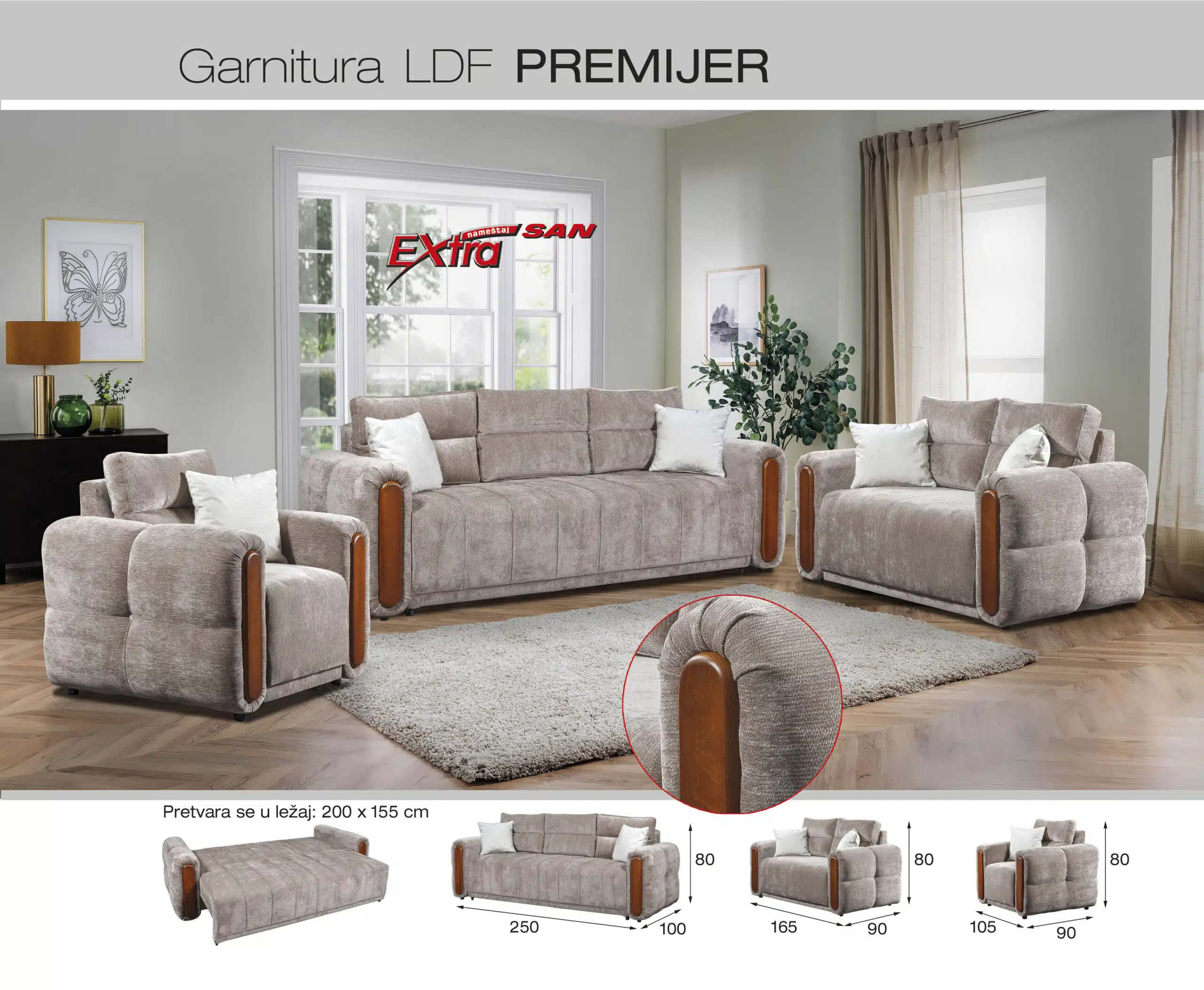Trosed, dvosed i fotelja Dionis je garnitura modernog dizajna koja se lako uklapa u različite enterijere. Veoma je elegantna i dopadljiva a njena lepota krije se u jednostavnim linijama. Prostoru daje notu luksuza