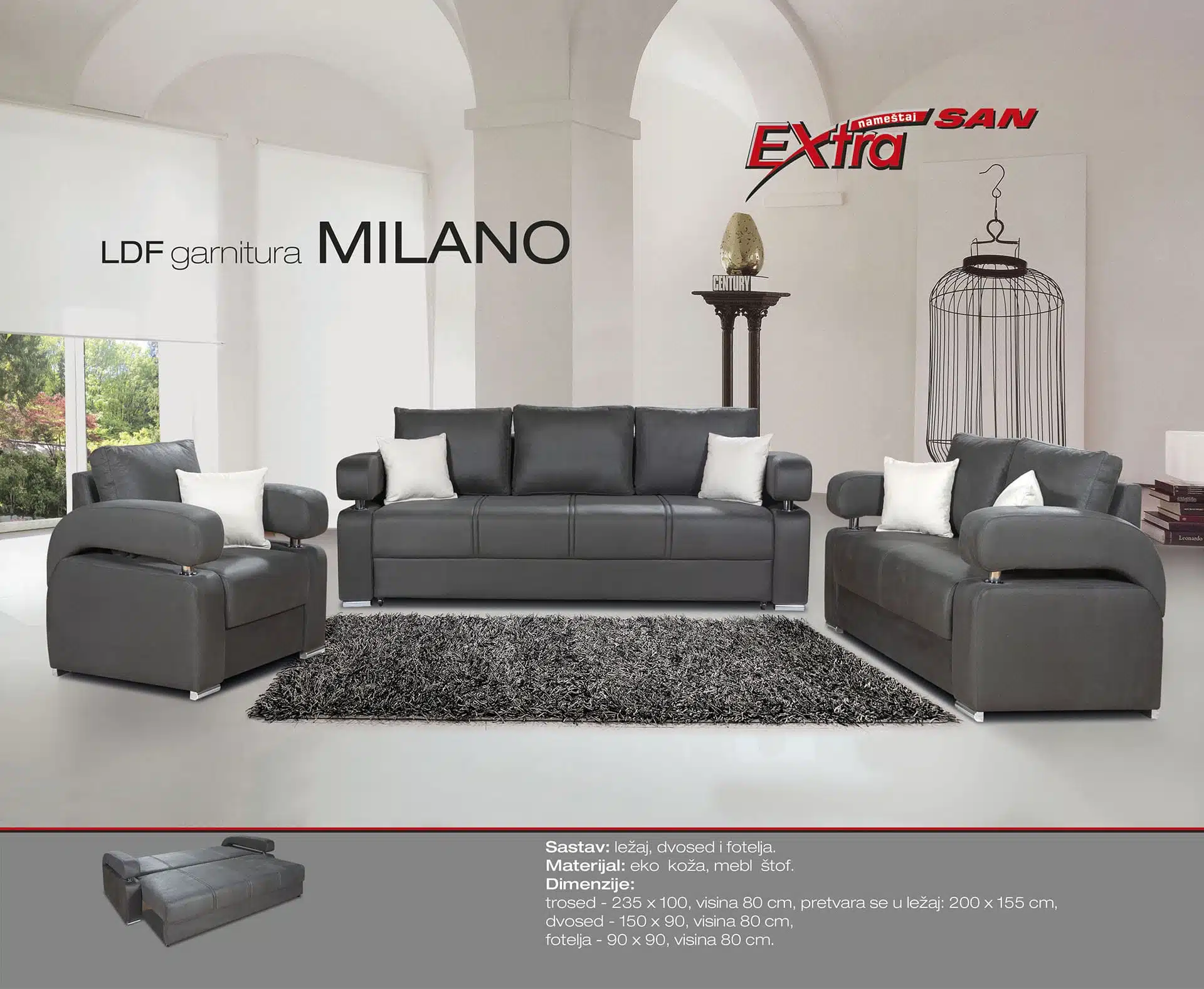 Svojom elegancijom oplemeniće svaki prostor. Spoj prefinjenosti i udobnosti daju notu luksuza, spoj klasičnog i modernog učiniće dnevnu prostoriju toplim i prijatnim mestom za boravak i omogućiće da uživate u svakom trenutku provedenom na ovoj garnituri.