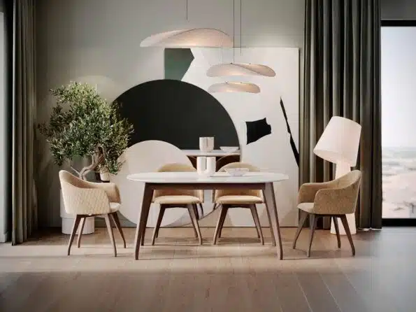 Nameštaj u enterijeru obojen je bojom drveta PROVIDNO BELA izuzev stola na razvlačenje koji je u VENGE boji.